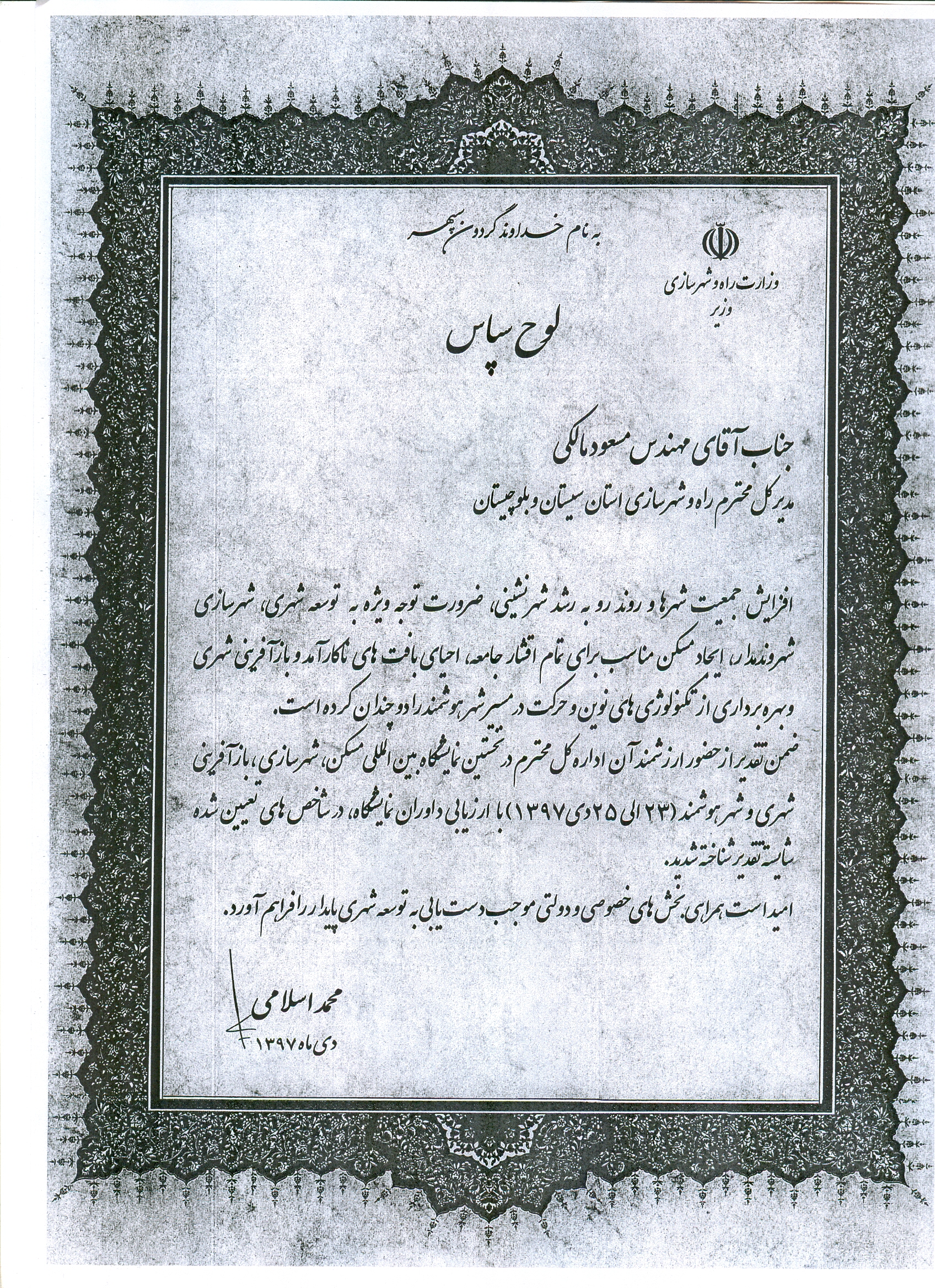 • دریافت لوح شایسته تقدیر از مقام عالی وزارت راه و شهرسازی در اولین نمایشگاه بین المللی مسکن، شهرسازی، بازآفرینی شهری و شهر هوشمند