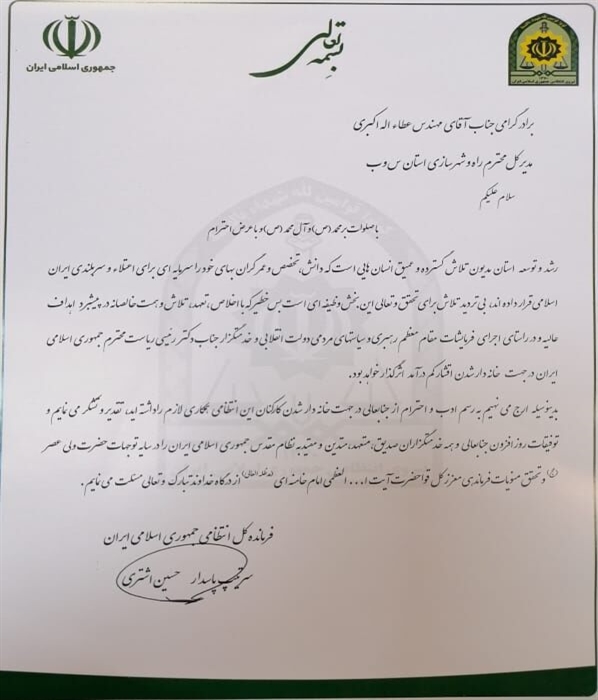 • تقدیر فرمانده کل انتظامی جمهوری اسلامی ایران از مدیر کل راه و شهرسازی سیستان و بلوچستان
