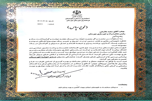 شهرستان مهرستان با مدیریت جهادی، اقدامات شایسته و برنامه محور مبتنی بر اهداف بیانیه گام دوم انقلاب و حرکت در راستای تحقق منویات مقام معظم رهبری و سیاست های دولت مردمی موفق به کسب رتبه نخست استانی در طرح نهضت ملی مسکن گردید، لذا ضمن قدردانی از اقدامات و تلاش های موثر شما بر اساس بررسی و ارزیابی های بعمل آمده رییس اداره راه و شهرسازی این شهرستان به عنوان مدیر نمونه شهرستان تعیین و معرفی می گردید.