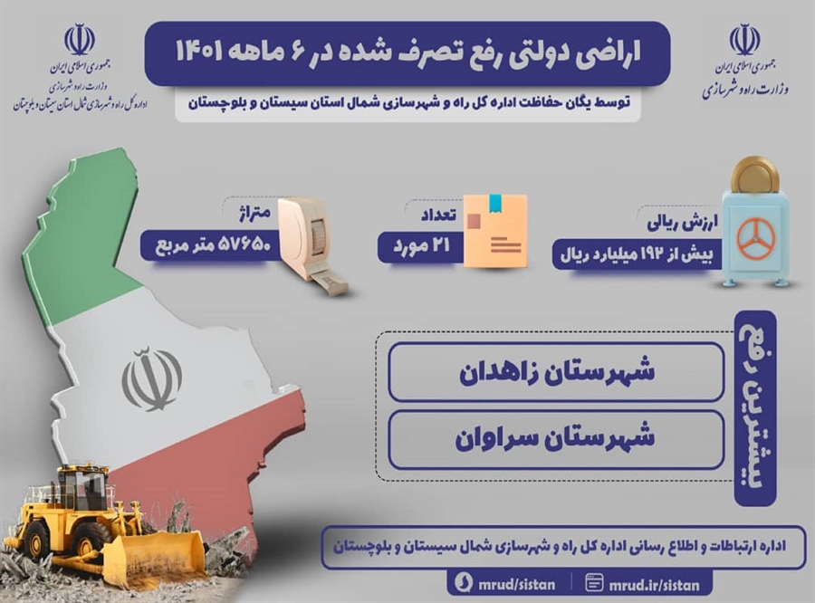 ۵۷ هزار و ۶۵۰ متر مربع از اراضی دولتی در محدوده تحت پوشش اداره کل راه و شهرسازی شمال سیستان و بلوچستان در ۶ ماهه سالجاری به ارزش بالغ بر ۱۹۲ میلیارد ریال با اجرای حکم قضایی توسط یگان حفاظت از اراضی رفع تصرف شد.