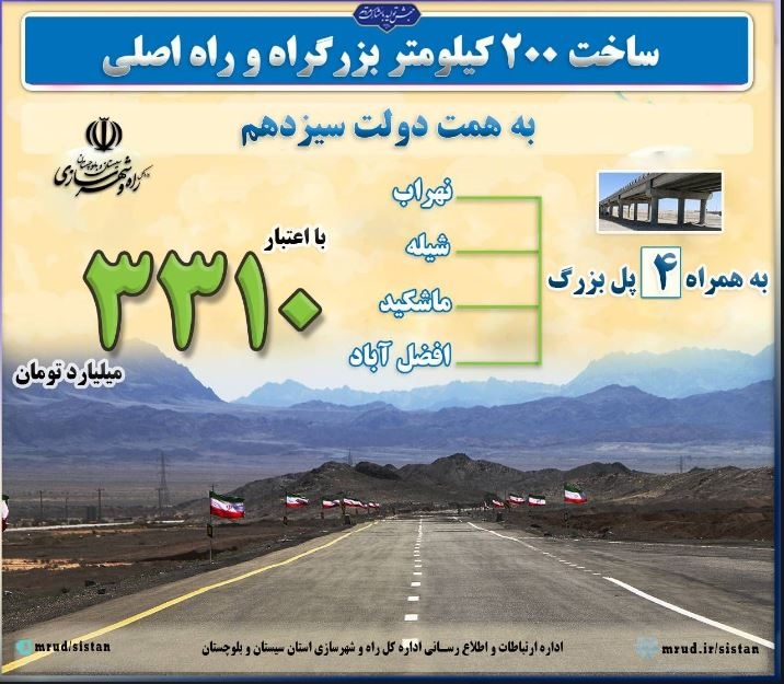 • اینفوگرافیک| ساخت۲۰۰ کیلومتر بزرگراه به همراه ۴ پل بزرگ در شمال سیستان و بلوچستان به همت دولت سیزدهم