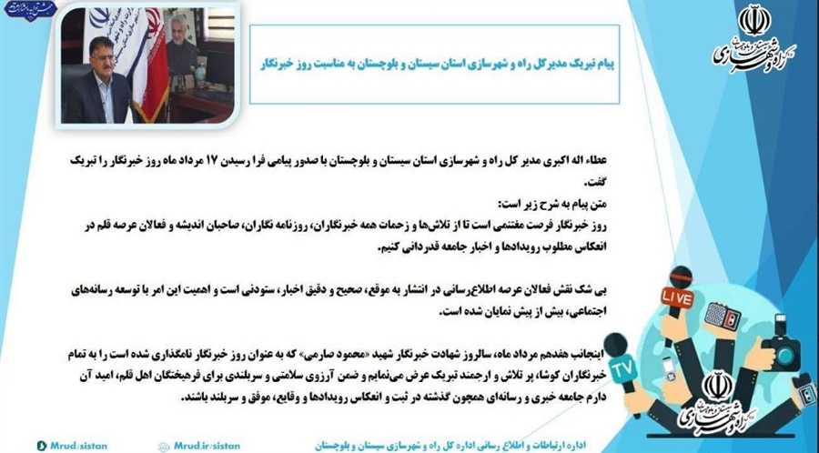 مدیر کل راه و شهرسازی استان سیستان و بلوچستان با صدور پیامی ۱۷ مرداد ماه روز خبرنگار را تبریک گفت.