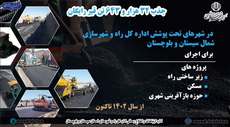• اطلاع نگاشت|جذب ۳۲ هزار و ۶۴۳ تن قیر رایگان برای اجرای پروژه‌های زیر ساختی راه، مسکن و حوزه بازآفرینی شهری راه و شهرسازی سیستان و بلوچستان
