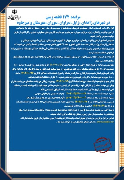• اطلاع نگاشت|آگهی مزایده واگذاری ۱۷۴ قطعه زمین شمال سیستان و بلوچستان