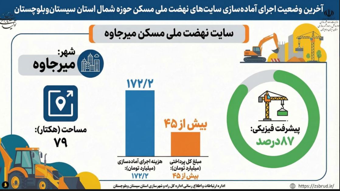 • اینفوگرافیک| پیشرفت ۸۷ درصدی آماده سازی سایت ۷۹ هکتاری نهضت ملی مسکن شهرستان مرزی میرجاوه